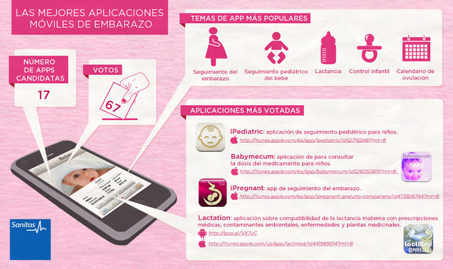 Entre las aplicaciones las categorías que ha identificado Sanitas son la de embarazo, que tanta información demanda, especialmente para los padres primerizos. También había aplicaciones que tenían en cuenta el seguimiento pediátrico del bebé, la lactancia, la ovulación y muchas más.