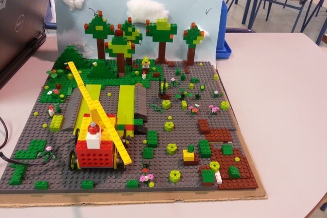 En el modelo de la imagen que ilustra el artículo utilizaron hasta tres puertos USB que conectados al ordenador permitían controlar un VAC, vehículo anti catástrofes (en la imagen), un satélite y un dron, vehículo no tripulado. El funcionamiento, que explicaron entre todos los alumnos poniendo a prueba su capacidad de comunicación, consistía en una detección de la catástrofe en el bosque por el satélite, una gestión en tierra por el VAC y un diagnóstico preciso con el dron, que como explicaron, no necesita tripulación permitiendo realizar trabajos precisos sin riesgo para las personas.