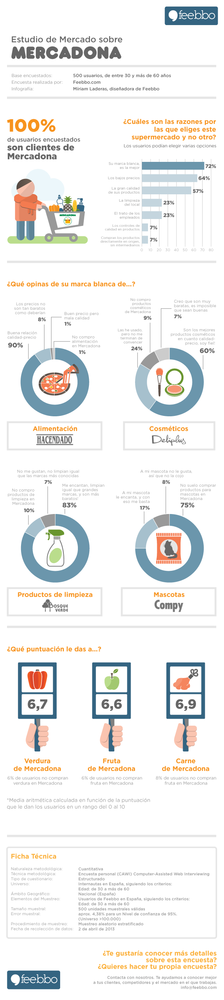 A través de la página de Feebbo he llegado al Estudio de mercado online publicado sobre Mercadona. En el momento de crisis actual en el que los recortes también tenemos que aplicarlos a la economía doméstica, resulta muy interesante echar un vistazo a esta sencilla infografía de Mercadona en la que se puede ver, por ejemplo, cuáles son las razones que elegimos las familias para comprar en Mercadona, las opiniones ante sus productos de marca blanca y las puntuaciones que asignamos a sus productos frescos: verdura, fruta y carne.