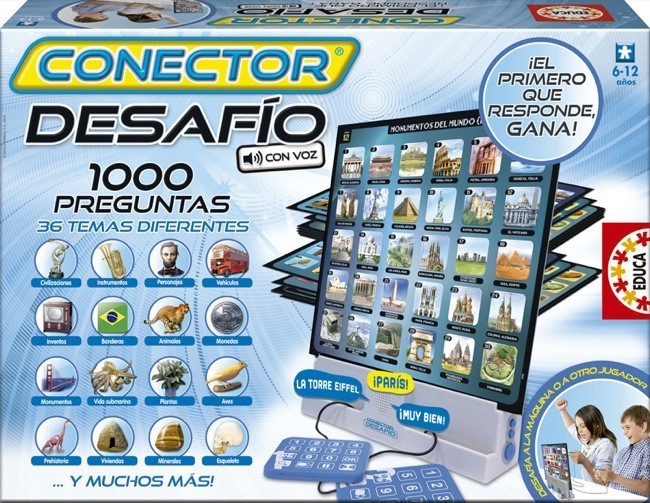 Y Conector Desafío con voz permite jugar, ya sea retándose a uno mismo o contra otro jugador. Los jugadores deben demostrar que no hay ningún tema que se les resista. La consola formula una de las más de 1.000 preguntas existentes sobre las temáticas más variadas y el más rápido en responder correctamente es el ganador. Incluye conocimientos de animales, monumentos, países, vehículos, personajes, etc. Es como participar en un concurso de preguntas y respuestas en casa. El juego cuenta con 36 paneles con fotografías e ilustraciones a todo color y con una base parlante que no solo formula las preguntas, sino que confirma respuestas, cuenta aciertos y errores y guía a los jugadores con numerosos mensajes. Está disponible para niños y niñas de entre 6 y 12 años de edad. El precio recomendado de venta es de 31,95 euros.