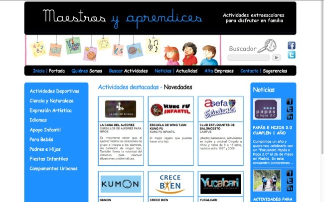Hemos estado revisando con los creadores de Maestros y Aprendices en qué consiste su proyecto en Internet. Nos han comentado que se trata de un sitio de carácter educativo en el que se puede acceder a un completo directorio de empresas que ofrecen a familias de la Comunidad de Madrid todo tipo de actividades extraescolares, campamentos urbanos y fiestas infantiles. Se trata de una iniciativa que impulsa la educación, primando las actividades deportivas, artísticas, científicas, de idiomas, de estimulación temprana, con terapias específicas de refuerzo académico y personal y muchas otras propuestas de interés.