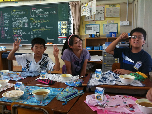 A la hora de la comida, los estudiantes japoneses siguen un ritual que incluye a los más grandes ayudando a servir comida, la misma que ellos degustarán. También hay oportunidad para que los niños hagan las preguntas que crean convenientes y aumenten sus conocimientos sobre nutrición.