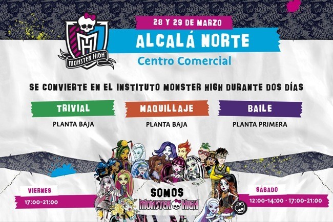 Durante los días 27 y 28 de marzo se puede acudir con los peques al Centro Comercial Alcalá Norte al evento organizado por las Monster High. Las actividades tendrán lugar el viernes de 17 a 21 horas y el sábado de 12 a 14 horas y de 17 a 21 horas.