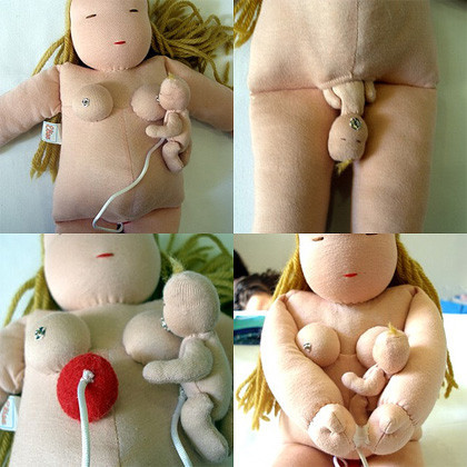 Esta muñeca que vemos en las fotografías está dando a luz, es un parto vaginal y nace un bebé incluso con cordón umbilical. Aunque no está destinada a que los niños o niñas jueguen con ellos. Se trata de unas figuras de trapo que se utilizan en el Proyecto Infancia Feliz, un programa de educación sexual y parto humanizado del Ministerio de Salud de Brasil.