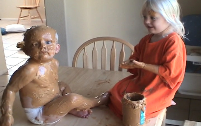 Algo así es lo que pasó en casa de Gina Gardner, cuando tras un rato de silencio su sentido arácnido (¿o sentido maternal?) le sacudió como un calambre en la espina dorsal avisándole de que algo habían hecho: "Demasiado tiempo sin oírles", se dijo. Así que cogió la cámara y fue a buscarles. Seguro que al verles se dijo eso de: menos mal que le dimos un hermanito a Emily, así ha podido ¡llenarle de crema de cacahuete!