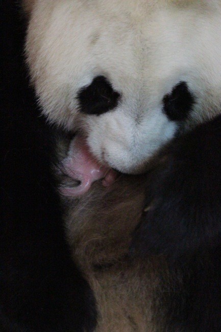 El pequeño osezno ha visto la luz con su característica piel rosada cubierta de una ligera capa de lanugo blanco que rápidamente experimentará los primeros cambios de coloración típicamente panda. En la imagen se pueden ver a madre e hijo descansando. Después de su nacimiento la nueva cría de oso panda gigante ha demostrado grandes dosis de personalidad. Durante el primer examen neonatal al que se le ha sometido, el equipo técnico y veterinario ha confirmado que se trata de un macho de potentes pulmones. El pequeño cachorro tiene un peso de 210 gramos y 15 centímetros de longitud, precisamente, el peso de los osos panda constituye uno de los datos más asombrosos de su proceso de crecimiento ya que éste se multiplica por cien desde el nacimiento hasta la edad adulta, cuando el macho alcanza los 130 kilogramos y la hembra los 90 kilogramos de media.