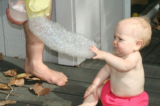 A través del orificio de la botella y una vez empapado el calcetín en el jabón, soplaremos y el jabón empezará a hacer las divertidas pompas que se harán serpientes enormes.