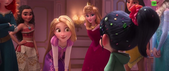 En una divertida escena de humor autoreferencial Vanellope entra por sorpresa en la habitación de las princesas, quienes le piden a la pequeña una prueba de que ella también es una de ellas.