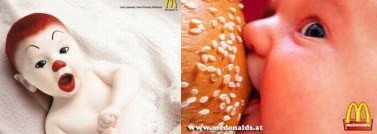 Estás imágenes pertenecen a la publicidad de Mc Donald´s en la India y en Europa. No pongo en duda su originalidad. Pero a decir verdad el bebé Ronald McDonald me parece sacado de una película de terror al estilo de Stephen King como dicen los chicos de Boing Boing. Fantasmal.