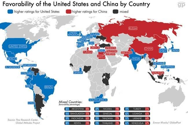 Por ejemplo, en Estados Unidos sólo el 35 por ciento tiene una opinión favorable hacia China y aún hay muchos países en azul, esto es, eligiendo al país de América del Norte. Aún así el rojo de China es muy destacado en el este de Europa y en Asia aunque también hay mucha igualdad en varios países que, en negro, no se definen totalmente por un país.