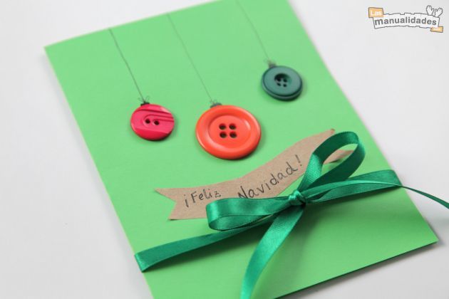 Primero doblamos cada cartulina por la mitad, y en lo que será la portada pegamos los botones, como si fueran bolas decorativas que cuelgan, después dibujamos con el rotulador el hilo del que penden. Podemos darle una forma más bonita al rectángulo y escribir una frase representativa, pegándolo debajo de los botones.