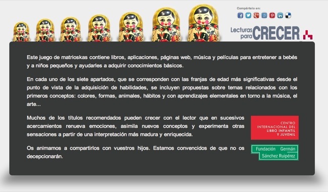 Desde el Centro Internacional del Libro Infantil y Juvenil de la Fundación Germán Sánchez Ruipérez de Salamanca nos han informado del proyecto Lecturas para crecer: primeros conceptos para descubrir el mundo. Se trata de una selección de libros, música, películas, aplicaciones y páginas web sobre temas relacionados con conceptos básicos propios de los primeros aprendizajes infantiles.