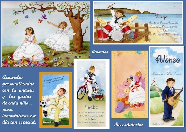 Hoy traigo una nueva propuesta de recordatorios para Comuniones, los podéis encontrar en Miles de Textos, y son obra de una ilustradora llamada Isabel Osma; quien plasma momentos mágicos en láminas para el recuerdo.