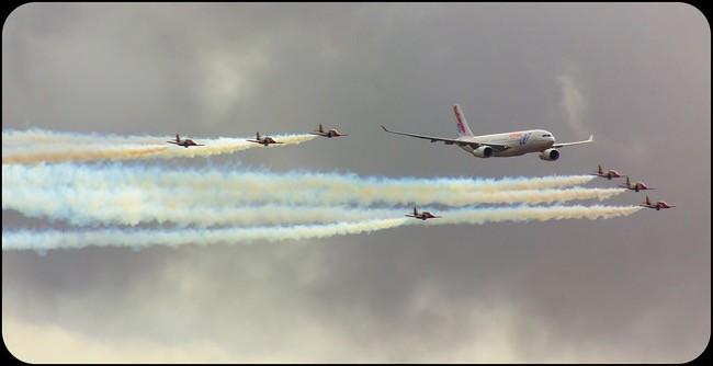 El festival aéreo internacional Aire 75 reunió a las equipos acrobáticos más importantes de Europa tales como la Patrouille de France (Alpha jet de Dassault / Dornier), los Frecce Tricolori (Aermacchi MB-339) y la Swiss Air Force PC-7 TEAM (Northrop F-5 Tiger II), entre otros. Por supuesto la Patrulla Águila, en la imagen escoltando a un avión Airbus A330 de Air Europa, la Patrulla Aspa de helicópteros y la patrulla acrobática de paracaidismo Papea además de más representantes de las diferentes unidades del Ejército del Aire. También hubo una exhibición estática, que son aviones en tierra que se pudieron ver de cerca y desde donde se pudo ver estupendamente a todas las aeronaves volando.