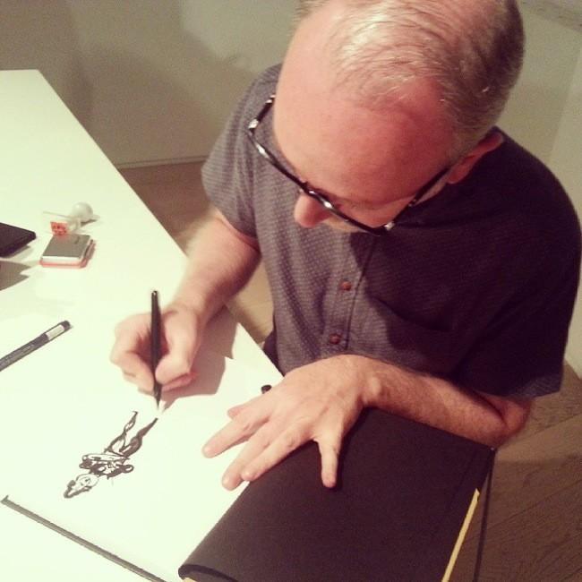 Escuchar a Javier fue fantástico porque durante la presentación utilizaba una pequeña cámara conectada a la mesa y sobre la que desplegaba su trabajo: bocetos, dibujos, originales, páginas con garabatos y que se proyectaba de forma simultánea en la pantalla de la sala de la conferencia. Javier explicó muchísimos detalles del proceso creativo aunque el que más secretos comentó fue Santiago García que desde Baltimore enseñó decenas de esquemas, guiones, estructura y formas de trabajar. El objetivo, como explicó Javier, era hacer un libro, un cómic, que según explican nuestros compañeros de Papel en Blanco, probablemente sea el cómic del año. Así que cuando terminó la charla de la presentación de la exposición Javier firmó ejemplares a los que nos compramos el cómic, en la imagen dedicándoselo a mi hija, y que nos leeremos en casa encantados.