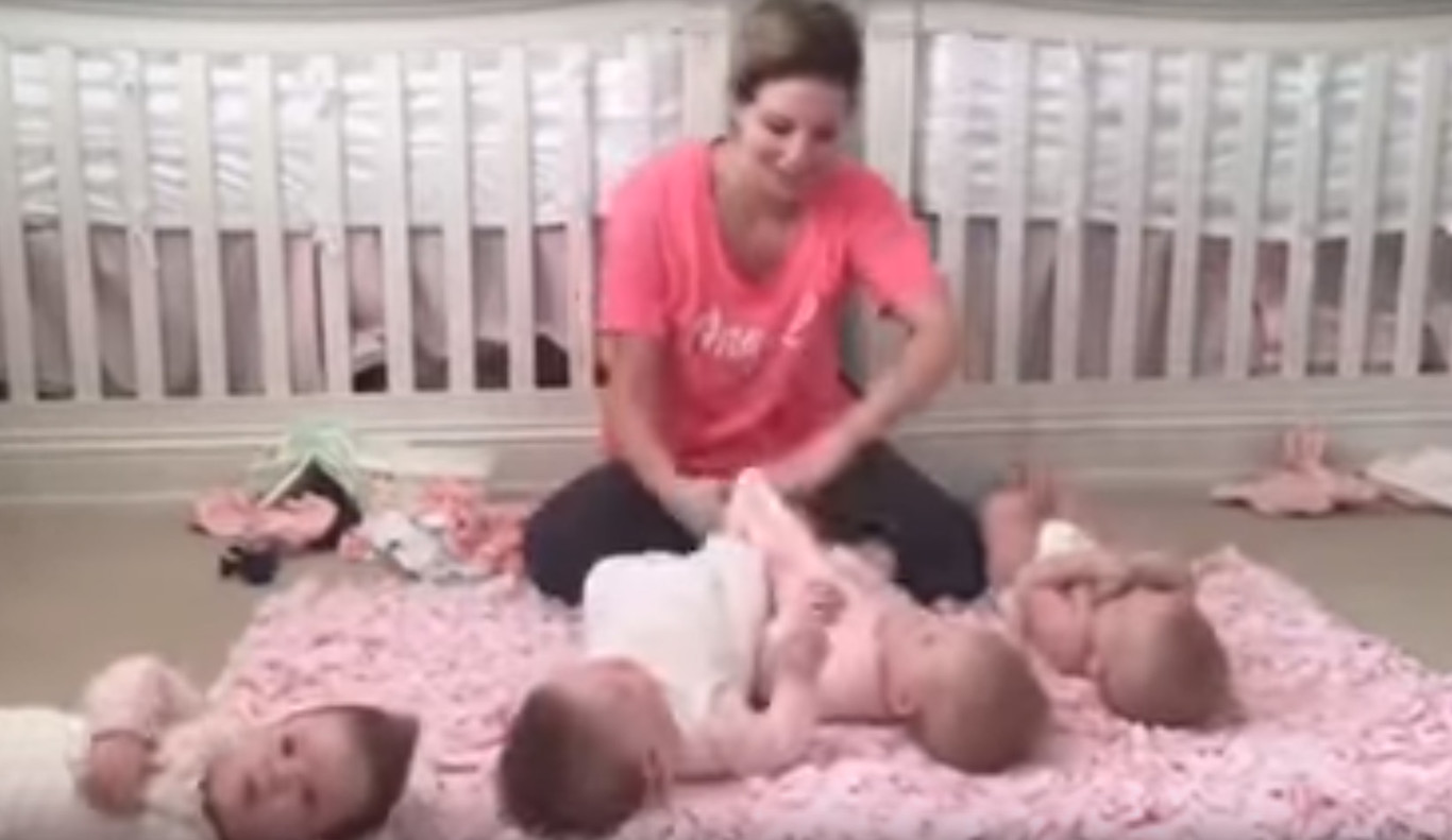 Como veis, grabado a cámara rápida, la rutina de esta madre, cada mañana, consiste en quitarles la ropa, ponerles un pañal limpio y ropa limpia, mientras las va intentando distraer con unos muñequitos que entre ellas mismas se roban.
