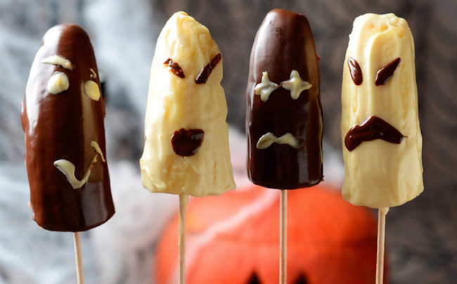 Así que va de plátanos, y de fantasmas, pero para ayudaros a resolver esta adivinanza nada difícil, os cuento que Angela (de Recetín), nos propone unas de estas frutas convertidas en dulces fantasmas merced al chocolate (con leche y blanco) que las cubre