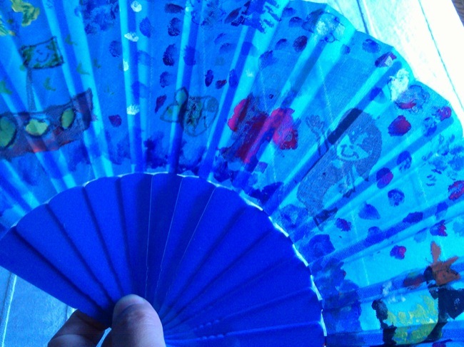 Y después hicimos un taller en el que los niños tenían que pintar ¡un abanico! (el de la imagen es el nuestro). Para ello había un montón de materiales: lápices y papel para realizar un boceto, y rotuladores y pinceles con pintura para pintar el abanico. Es de tela y con varillas de plástico. Lo pintamos por la zona de la tela exclusivamente para no chocar con las varillas. Luego lo dejamos secar y nos lo pudimos llevar plegado.