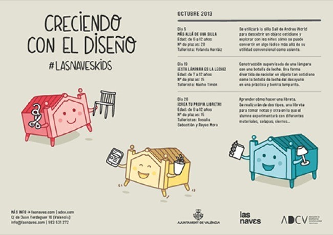 La Asociación de Diseñadores de la Comunidad Valenciana (ADCV) junto con Las Naves, Espacio de Creación Contemporánea, organizan el proyecto llamado #LasNavesKids que pretende desarrollar la creatividad de los niños y presentarles los retos y desafíos de la profesión del diseñador. Se trata de talleres dirigidos e impartidos por profesionales del diseño que se realizarán entre las 10:30 y las 13:00 de la mañana. La inscripción hay que hacerla a través de la página de Las Naves del Ayuntamiento de Valencia. El precio de los talleres es de 5 euros y todos los menores deberán ir acompañados de sus padres o tutores.