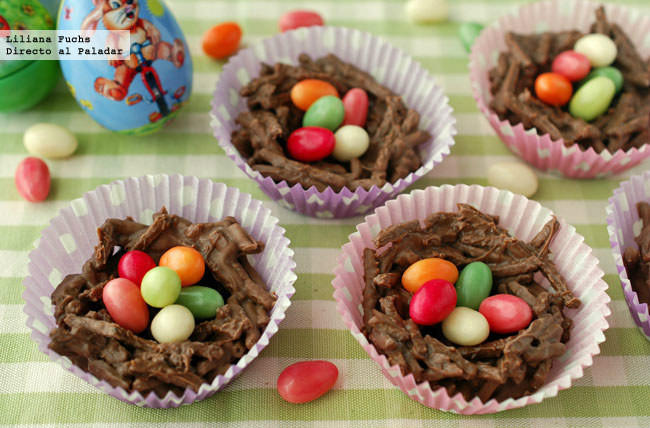 No me he podido resistir a compartir con vosotros estos deliciosos nidos de Pascua crujientes de chocolate que Liliana Fuchs presentó hace unos días en Directo al Paladar. Y es que ya estamos en primavera y todo nos recuerda a la vida, así que ¿por qué no emular a los huevos que ponen los pajaritos en nidos cuidadosamente construidos?