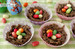 Colocamos porciones pequeñas en cápsulas de papel formando un nido con agujero en el centro. Tras haberse solidificado, podemos añadir los huevos de caramelo o grageas de chocolate bañadas en color.