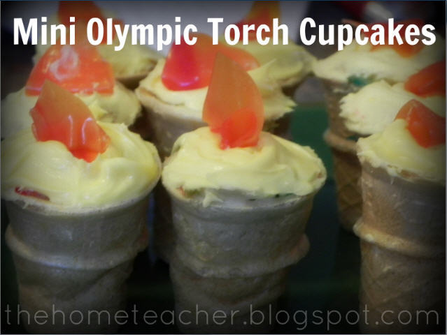 Keri desde su blog ‘thehometeacher’ nos da una rica idea para confeccionar mini antorchas olímpicas (muy dulces por cierto). Ha horneado una masa para pasteles preparada, aunque creo que sería más práctico rellenar los cucuruchos con helado de vainilla que podéis comprar en el super, y cortar láminas finitas de media naranja confitada, para hacer las veces de llama.
