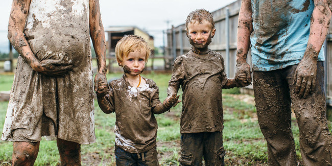 Debido a la copiosa lluvia de los días anteriores, el jardín estaba lleno de charcos de barro, así que pensaron que aquello que parecía un inconveniente se convirtiera en una ventaja y decidieron hacer una sesión con un concepto muy diferente al de familia impecable posando sobre el césped.