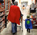 Se trata de una fotografía que nos muestra un niño pequeño vestido con su capa de super héroe, caminando feliz al lado de su padre quien acompaña el disfraz de su hijo con otra capa mientras arrastra el carrito de la compra y observa las estanterías.