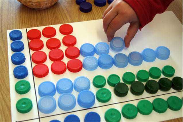 - Tapones de color azul, verde, rojo y blanco, una cartulina de tamaño A3, rotuladores de colores que contrasten con el tono de la cartulina.