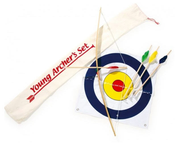 Su Juego de Arco con Flechas está fabricado en bambú (el arco) y madera (las flechas), además las puntas son ventosas, y el set se completa con una cuerda de repuesto y una lámina – diana para que prueben puntería.