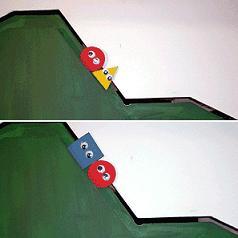 Pero luego aparece un cuadrado (boicoteador) mostrando su naturaleza malvada, ya que empujaba a la bola hacia el sentido contrario impidiéndole llegar a la cima. También se mostró a los bebés otra animación que ni colaboraba ni entorpecía el trabajo de la bola, es el personaje neutro.