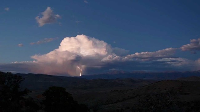 Jeff Sullivan, que tiene un montón de vídeos interesantes en su canal de YouTube, se fue a fotografiar una lluvia de meteoritos a la frontera de California con Nevada, cerca de la ciudad de Bridgeport y lo que consiguió fue ver la formación de una tormenta a última hora de la tarde. En el vídeo se puede ver cómo se juntan y crecen las nubes hasta formar una tormenta con todos los elementos: rayos, truenos, agua y nubes negras. Como dicen en Microsiervos hay que fijarse que lo que se está viendo son toneladas de agua en forma de nubes chocando entre ellas.