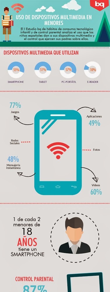 La compañía bq ha publicado hace unos días los resultados del I Estudio de hábitos de consumo tecnológico que indica que 5 de cada 10 niños menores de 18 años tiene un smartphone. Al parecer la cifra no sorprende tanto si tenemos en cuenta que uno de los regalos estrella de la Primera Comunión son los teléfonos móviles. Por lo que he podido leer en el blog de Diana González el 30% de los peques españoles de 10 años de edad tiene un teléfono móvil, cuando cumplen los 12 años, el salto a secundaria, casi el 70% utilizan un dispositivo móvil y cuando cumplen los 14 el porcentaje se eleva hasta el 83%. En la siguiente infografía, publicada en bq, se pueden ver más detalles de este tipo de consumo entre los peques españoles.
