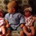 El bebé, que se llama Landon, es algo mayor que otras dos pequeñas gemelas vestidas exactamente igual. Lo han colocado en medio de las dos: una a su derecha aparece llorando y a su izquierda, lo que el bebé percibe como la misma niña, está tranquila.