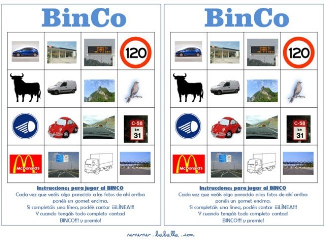 El binco es el bingo en el coche, un invento de Baballa que he oído en la radio que es infalible para conseguir que los niños se entretengan un rato mientras viajamos con ellos en el coche.