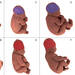 En esta primera imagen, los huesos frontales están marcados en rosa, los parietales en verde y el hueso occipital en azul. En la vista anterior (A, B), se observó que la fontanela anterior disminuía de tamaño durante el parto. En la vista lateral (C, D), los huesos del cráneo cambian en orientación y superposición. En la vista superior (E, F), se observó que las fontanelas anterior y posterior disminuían en tamaño durante el parto.