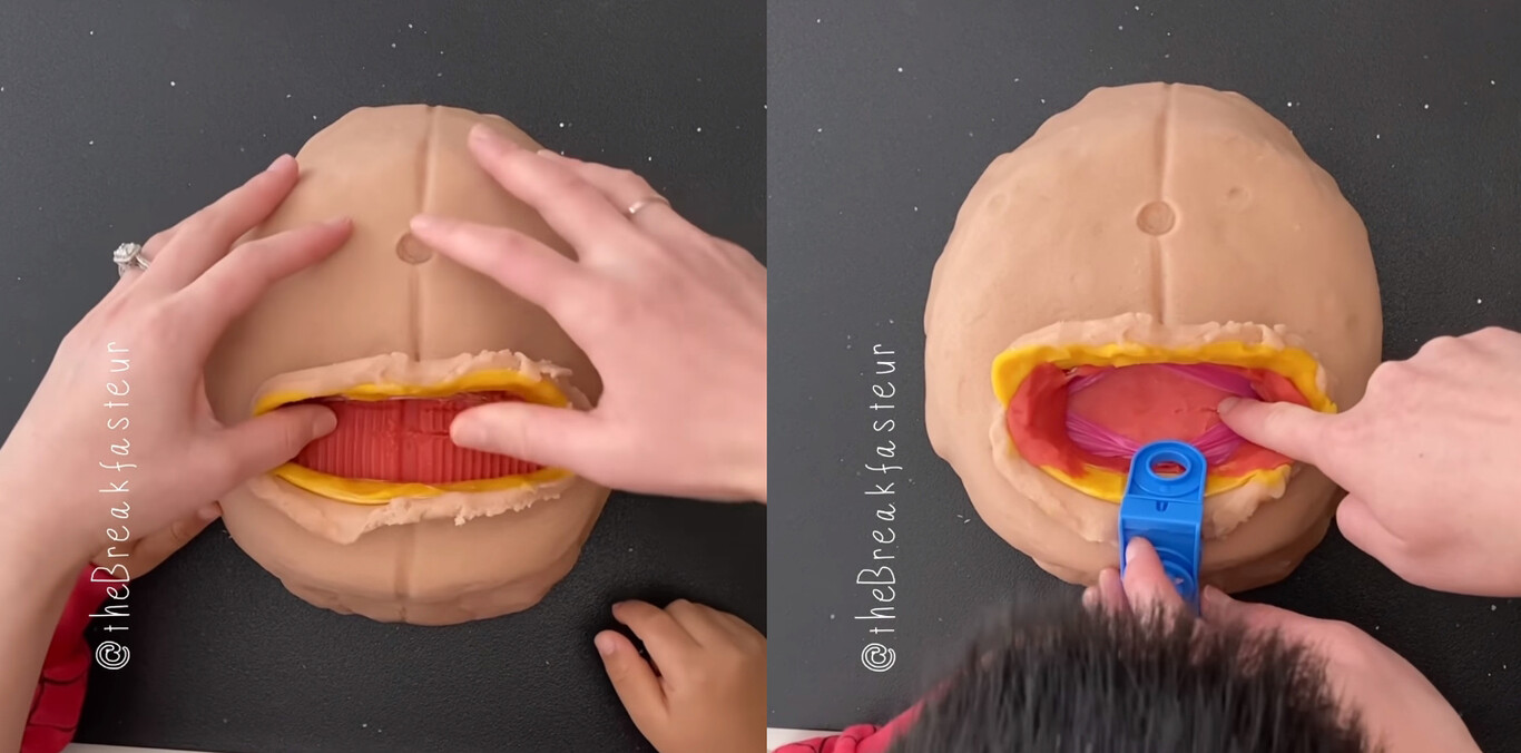 En el vídeo, podemos ver cómo logró crear una barriga muy detallada con plastilina, mientras va guiando a su hijo, quien realiza los cortes y movimientos que suelen realizarse durante una cesárea. Incluso al final, el "bebé" tiene su propia placenta y el niño corta el "cordón umbilical" después de pinzarlo.