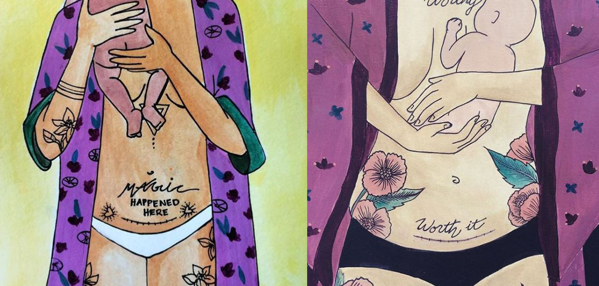 En las ilustraciones dedicadas a las madres que han tenido cesárea, Catie incluye frases como "Aquí ocurrió magia" o "Lo vale", cerca de las ilustraciones que representan una cesárea en el vientre de las madres que aparecen en sus pinturas.