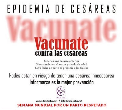La asociación argentina Dando a luz me ha sorprendido gratamente con este impactante cartel con el que realiza su campaña en la Semana Mundial por un Parto Respetado. "Vacúnate contra la cesárea" dice, y enumera los factores no médicos de riesgo para sufrir una.