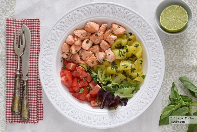 | Comida | Ensalada templada de patata y salmón con hierbas frescas. Plátano |