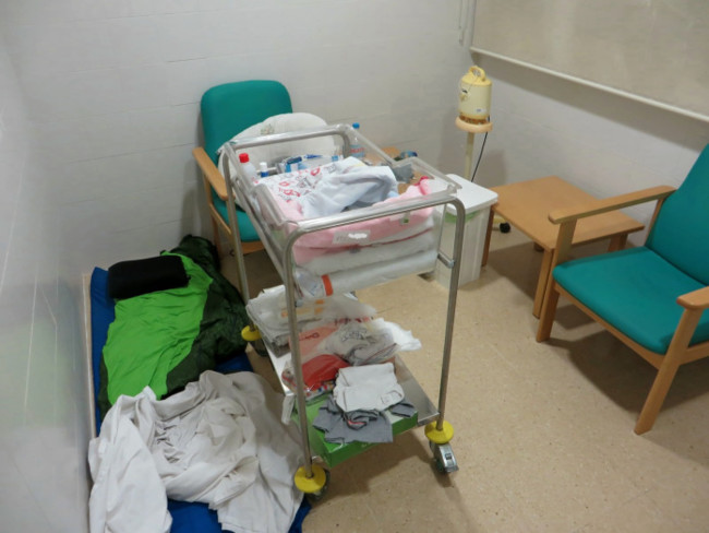 La primera noche, las dos estaban ingresadas en el hospital y, en consecuencia, ella podía levantarse tantas veces como su hija necesitara alimento. Pero a la segunda noche, como madre que ha dado a luz sana, se le dio el alta, perdiendo ese privilegio: ya no tenía habitación, ni cama, ni nada que se le pareciese. Solo unas sillas incómodas al lado de su hija.