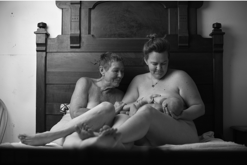 Me encontré con ella casi por casualidad, y es, sin duda, una de las imágenes más bonitas y significativas que he visto últimamente. Las mujeres como vínculo generacional, desnudas sobre una cama con historia, celebrando la llegada de un nuevo miembro a la familia.