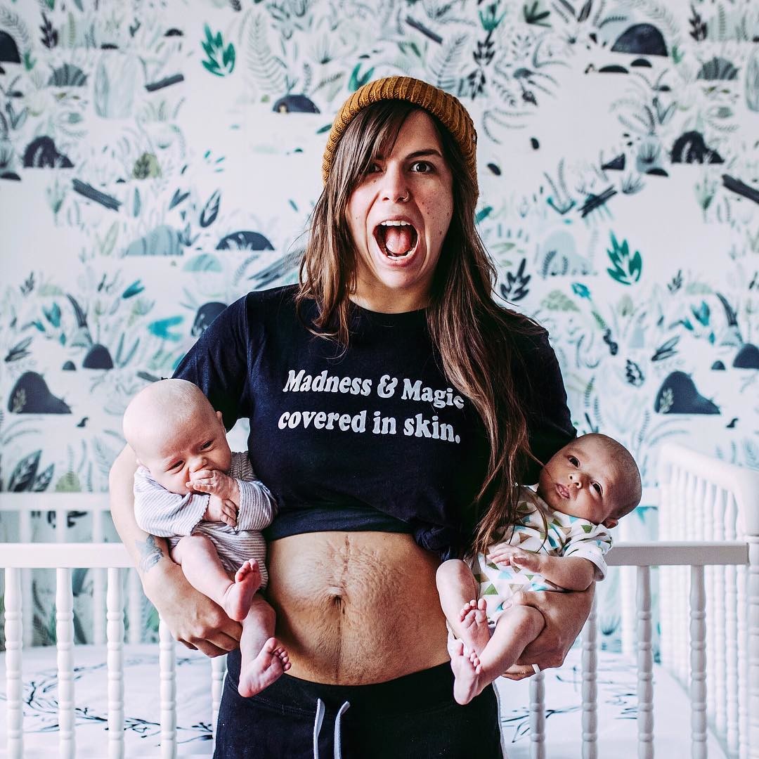 "A 8 semanas después del parto. Un recordatorio de que necesito ser tan amable conmigo misma como lo sería con una amiga que no tiene confianza en su cuerpo. Un recordatorio de que los milagros de la vida a menudo dejan sus marcas en nuestros cuerpos. ¡Todos somos locura y magia cubiertos de piel!”
