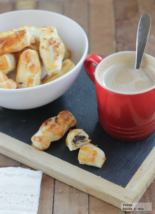 Estos caramelitos de hojaldre rellenos de chocolate y cubiertos con granillo de almendra son excelentes para hacer con los niños que se divierten muchísimo con su preparación y luego los disfrutan en el desayuno o en la merienda, o cuando quieran algo de picoteo en tamaño pequeño.