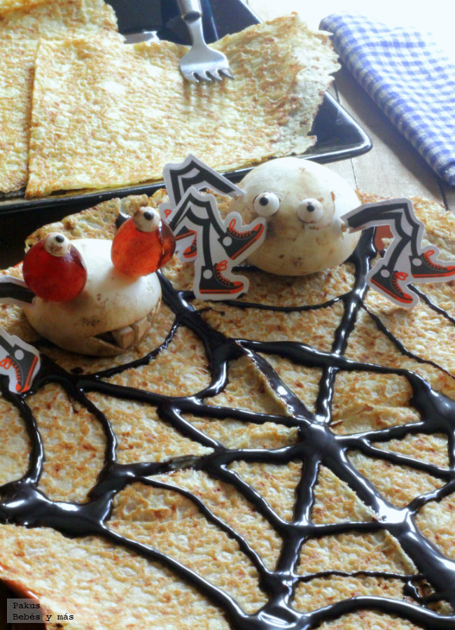 Terminamos la presentación colocando las arañas sobre una crêpe, tras dibujar una telaraña con sirope de chocolate. Los niños se lo pasarán muy bien haciendo este dibujo.