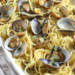 En otra sartén, pochamos la cebolla y el diente de ajo muy picados y cuando la cebolla esté blandita, añadimos el caldo reservado de abrir las almejas y también el perejil picado. Dejamos que se termine de evaporar el alcohol y añadimos las almejas y medio cucharón del agua en la que estamos cociendo la pasta, que tendremos en una cazuela aparte.