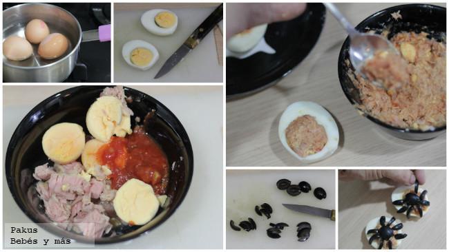Esta receta en realidad consiste simplemente en poner unas arañas hechas con aceitunas sobre los huevos rellenos pero a los niños les encanta colocarlas, (aunque algunas patas queden mal colocadas) y es divertido ver su esfuerzo para colaborar.