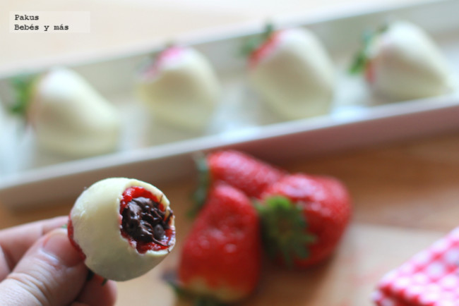 Cuando el chocolate blanco se solidifique en la nevera, tendremos las fresas de dos chocolates listas para llevárselas a mamá y darle una buena sorpresa.