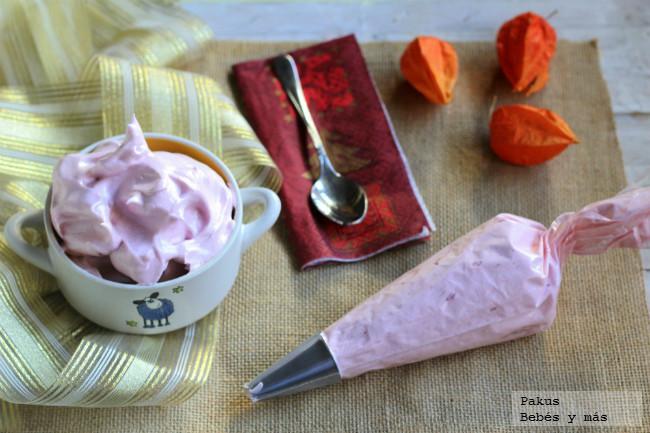 En ese momento los niños pueden añadir el azúcar glacé poco a poco mientras nosotros (o el robot) seguimos batiendo. Enseguida, la clara empieza a espesar y aumentar de volumen y se empiezan a formar "picos" al batir. Ahí podemos añadir el sirope que aportará sabor y color a nuestros merengues, mientras continuamos batiendo hasta obtener una crema firme, espesa y bien montada. Los peques se van a chupar los dedos, y podemos dejarles meter un dedo y probar.