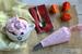 - 2 claras de huevo, 2 cucharadas de azúcar glacé y sirope de frambuesa